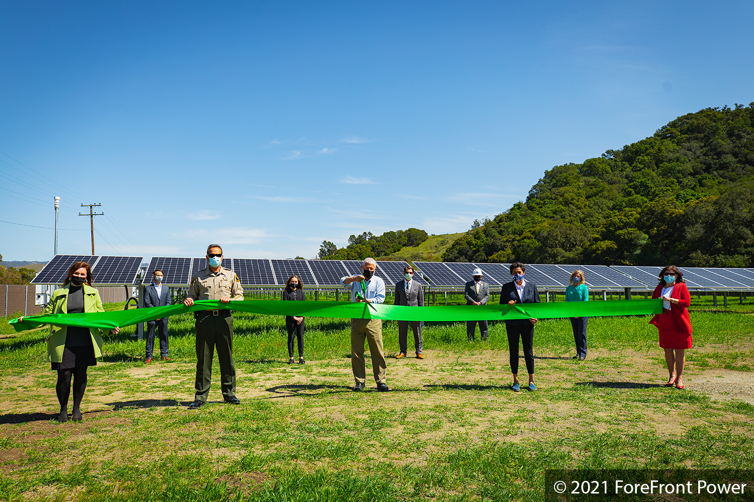 SAN LUIS OBISPO, Calif. -- April 20, 2021 -- The County of San Luis Obispo and ForeFront Power today celebrated the completion of a 1.2 megawatts-DC (MWdc) solar energy project at the County Operations Center. Developed, financed, owned, and operated by ForeFront Power, the project includes a total of 3,294 solar modules ground-mounted on 6 acres of land behind the County Honor Farm and parallel to Calif. State Highway 1.
