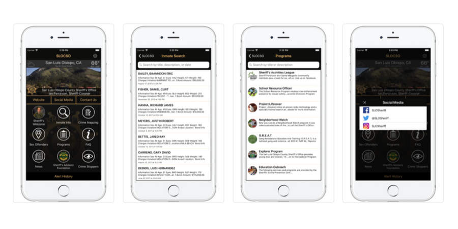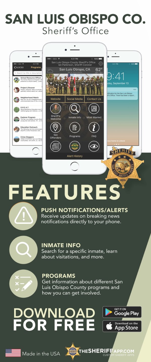 It contains many of the same features you can find on www.slosheriff.org like inmate information, press releases, and all the different Sheriff's Office programs and how you can get involved.