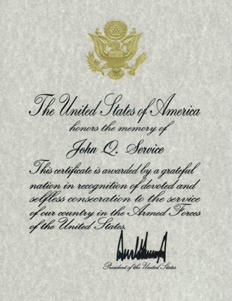 Did you know that family and friends of the deceased veteran, or someone acting on their behalf, may request a Presidential Memorial Certificate? A Presidential Memorial Certificate (PMC) is a gold-embossed paper certificate bearing the official signature of the President of the United States. It honors the memory of a deceased honorably discharged Veteran and expresses the country’s grateful recognition of his or her service in the Armed Forces.